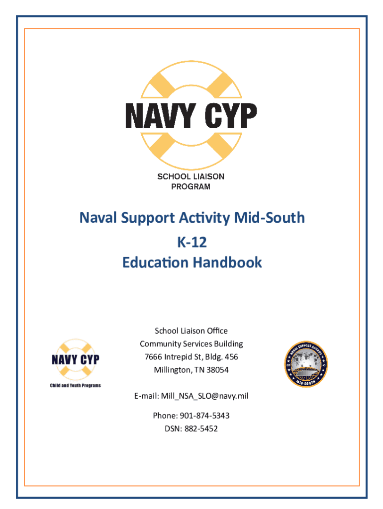 Naval Support Activity MidSouth K12 Education HandbookSchool Liaison Office Community Services Building 7666 Intrepid St, Bldg. 456 Millington, TN 38054 Email: Mill_NSA_SLO@navy.mil Phone: 9018745343