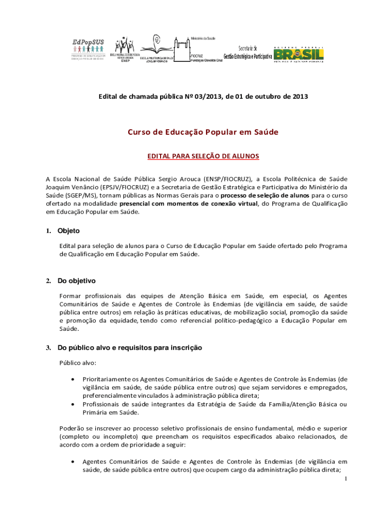 Edital de Canada public N 03/2013, DE 01 DE outro de 2013Curso de Educator Popular em Sade