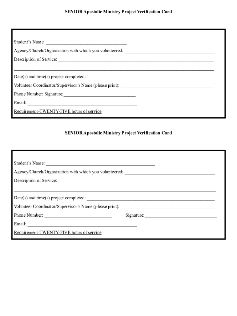 SENIOR Apostolic Ministry Project Verification CardStudents Name ___ Agency/Church/Organization with which you volunteered: ___ Description of Service: ___ ___ Date(s) and time(s) project completed: