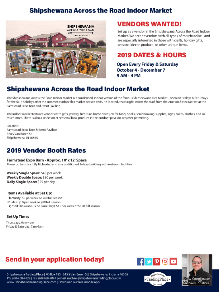 Shipshewana Across the Road Indoor Market VENDORS WANTED! Set up as a vendor in the Shipshewana Across the Road Indoor Market. We accept vendors with all types of merchandise and are especially interested
