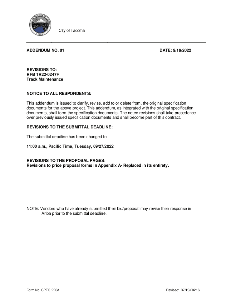 City of TacomaADDENDUM NO. 01DATE: 9/19/2022REVISIONS TO: ROB TR220247F Track MaintenanceNOTICE TO ALL RESPONDENTS: This addendum is issued to clarify, revise, add to or delete from, the original