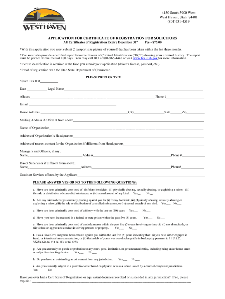 4150 South 3900 West Haven, Utah 84401 (801)7314519APPLICATION FOR CERTIFICATE OF REGISTRATION FOR SOLICITORS All Certificates of Registration Expire December 31stFee $75.00×With this application
