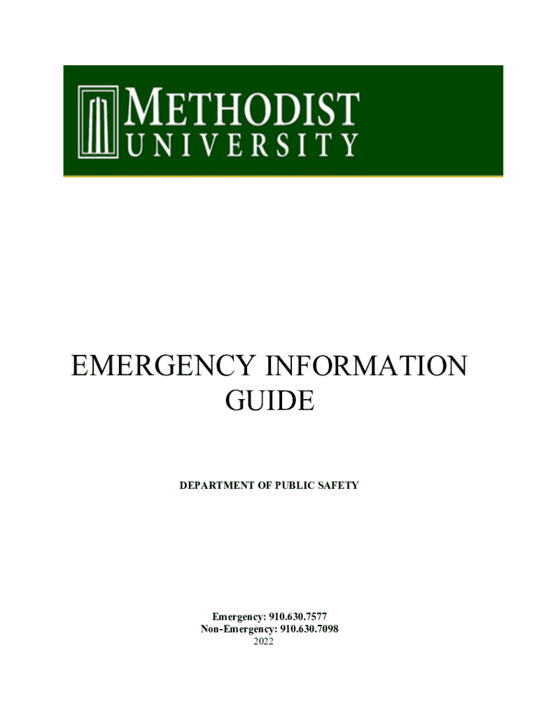 EMERGENCY INFORMATION GUIDE DEPARTMENT OF PUBLIC SAFETYEmergency: 910.630.7577 Emergency: 910.630.7098 2022INTRODUCTION This Emergency Information Guide is intended for use by faculty, staff, and