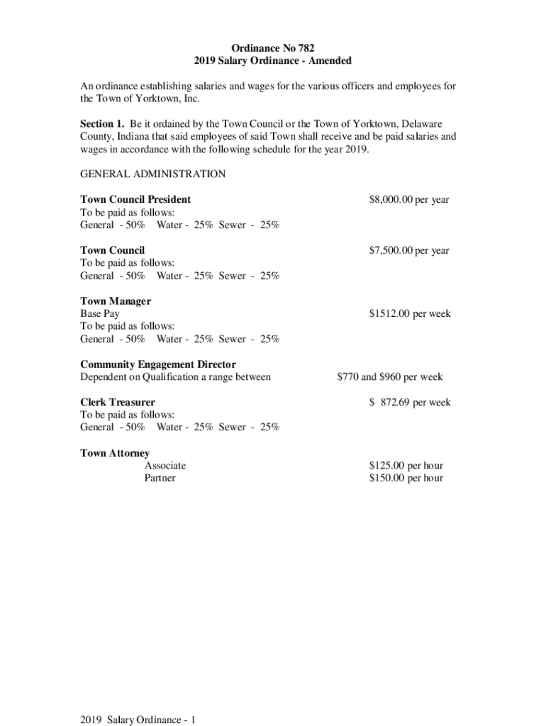 Ordinance No 782 2019 Salary Ordinance Amended An ordinance establishing salaries and wages for the various officers and employees for the Town of Yorktown, Inc. Section 1. Be it ordained by the Town