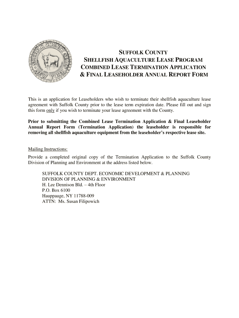 SUFFOLK COUNTY SHELLFISH AQUACULTURE LEASE PROGRAM COMBINED LEASE TERMINATION APPLICATION & FINAL LEASEHOLDER ANNUAL REPORT FORM This is an application for Leaseholders who wish to terminate their