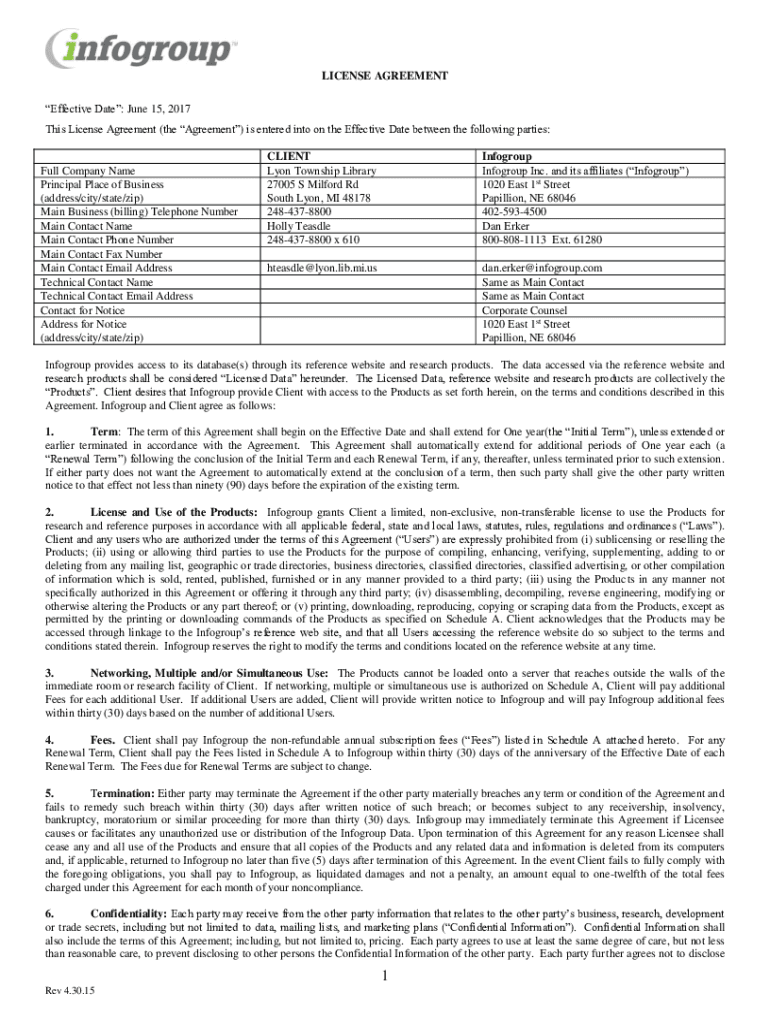 LICENSE AGREEMENT Effective Date: June 15, 2017, This License Agreement (the Agreement) is entered into on the Effective Date between the following parties:Full Company Name Principal Place of Business
