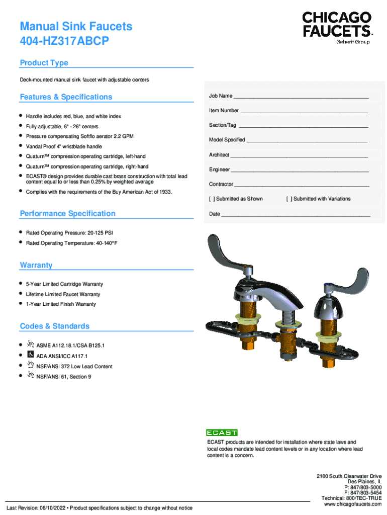 Manual Sink Faucets 404HZ317ABCP Product Type Deck mounted manual sink faucet with adjustable centersFeatures & Specifications Job Name ___ Item Number ___Handle includes red, blue, and white index
