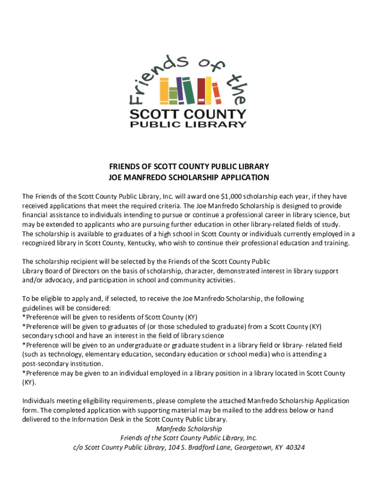 FRIENDS OF SCOTT COUNTY PUBLIC LIBRARY JOE MANFRED SCHOLARSHIP APPLICATION The Friends of the Scott County Public Library, Inc. will award one $1,000 scholarship each year, if they have received applications