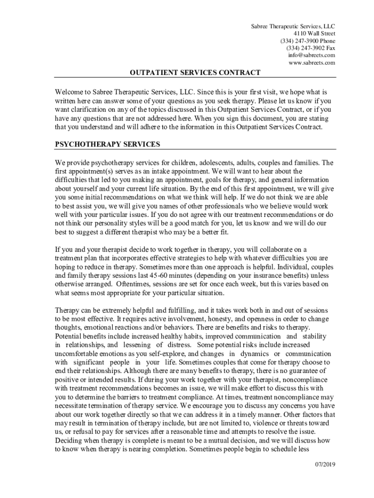 Sabre Therapeutic Services, LLC 4110 Wall Street (334) 2473900 Phone (334) 2473902 Fax info@sabreets.com www.sabreets.comOUTPATIENT SERVICES CONTRACT Welcome to Sabre Therapeutic Services, LLC. Since