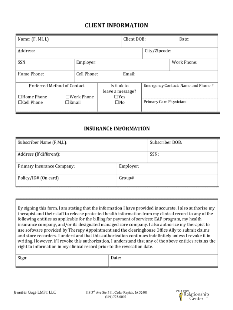 CLIENT INFORMATION Name: (F, MI, L)Client DOB:Address:City/Zip code:SSN:Employer:Home Phone:Cell Phone:Preferred Method of Contactable Phone Cell Phone Date:Work Phone Metalwork Phone: Email: Is it