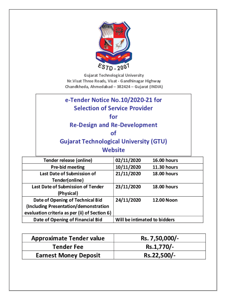 Gujarat Technological University NR. Visit Three Roads, Visit Gandhinagar Highway Chandkheda, Ahmedabad 382424 Gujarat (INDIA)tender Notice No.10/202021 for Selection of Service Provider for Redesign