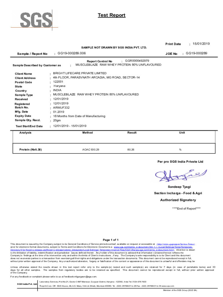 SAMPLE NOT DRAWN BY SGS INDIA PVT. LTD.: GG19000289.006Sample / Report No Sample Described by Customer as:Report Control No