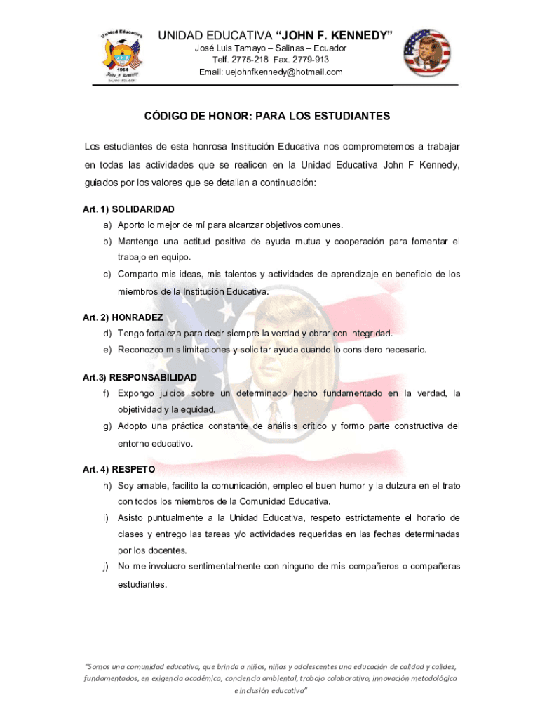 Email: uejohnfkennedy@hotmail.comCDIGO DE HONOR: PARA LOS ESTUDIANTES de ESTA honors Institution Educative