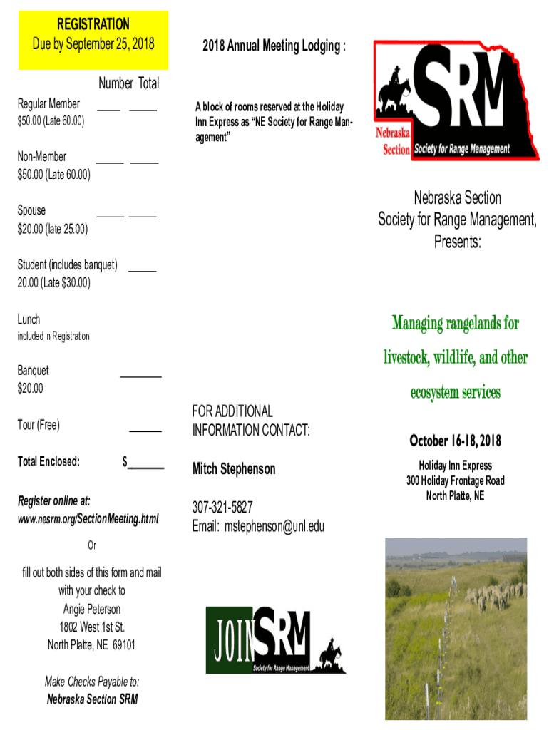 REGISTRATION Due by September 25, 20182018 Annual Meeting Lodging :Number Total Regular Member______$50.00 (Late 60.00)A block of rooms reserved at the Holiday Inn Express as NE Society for Range