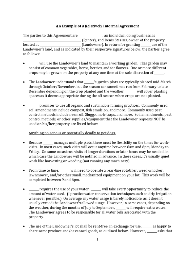 An Example of a Relatively Informal Agreement The parties to this Agreement are ___, an individual doing business as ___ (Renter), and Denis Stairs, owner of the property located at ___ (Landowner).