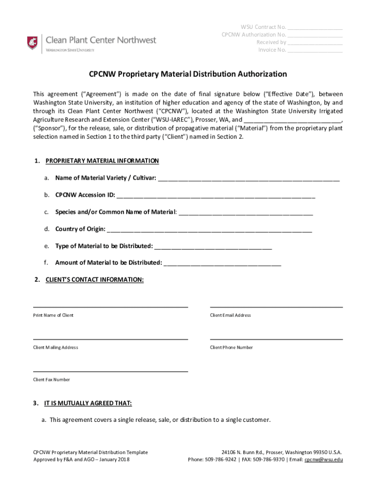 WSU Contract No. ___ CPC NW Authorization No. ___ Received by ___ Invoice No. ___CPC NW Proprietary Material Distribution Authorization This agreement (Agreement) is made on the date of final signature