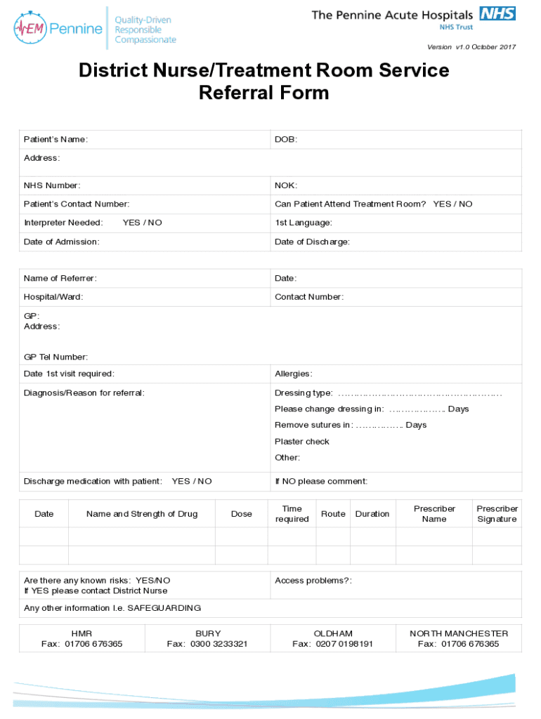 ! ! Version v1.0 October 2017District Nurse/Treatment Room Service Referral Form Patients Name:DOB:Address: NHS Number: NHS Number: Patients Contact Number: Patients Contact Number: Interpreter Needed: