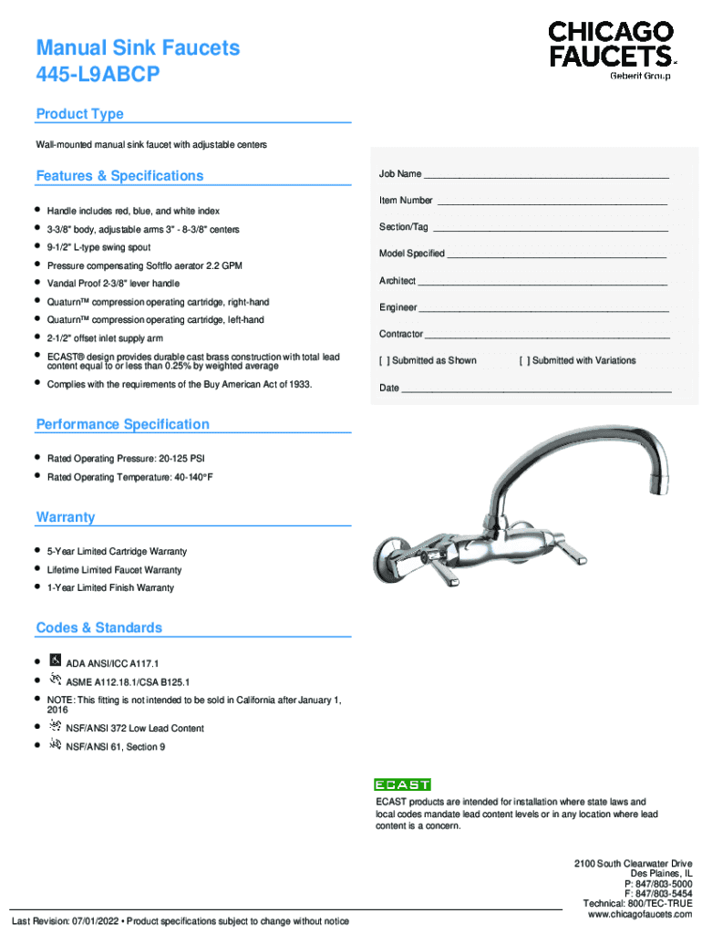 Wall mounted manual sink faucet with adjustable centersFeatures & Specifications Job Name ___