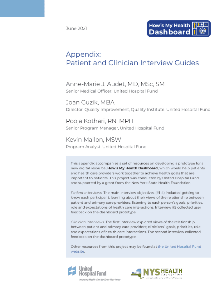 June 2021Hows My HealthDashboardAppendix: Patient and Clinician Interview Guides Annemarie J. Audit, MD, M.Sc., SM Senior Medical Officer, United Hospital Fund Joan GUI, MBA Director, Quality Improvement,