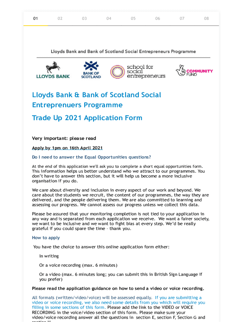 0102030405060708Lloyds Bank & Bank of Scotland Social Entrepreneurs Program Trade Up 2021 Application Form Very important: please read Apply by 1pm on 16th April 2021 Do I need to answer the Equal