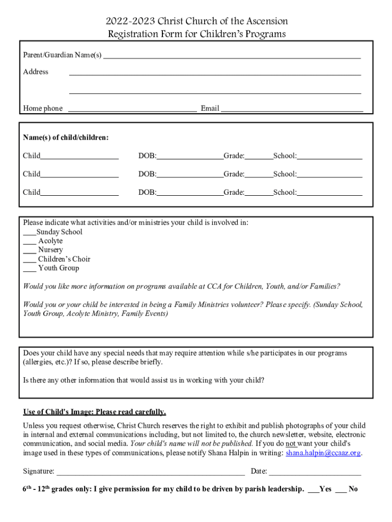 20222023 Christ Church of the Ascension Registration Form for Children's Programs Parent/Guardian Name(s) Addressable phoneEmailName(s) of child/children: Child DOB:Grade:School:Child DOB:Grade:School:Child