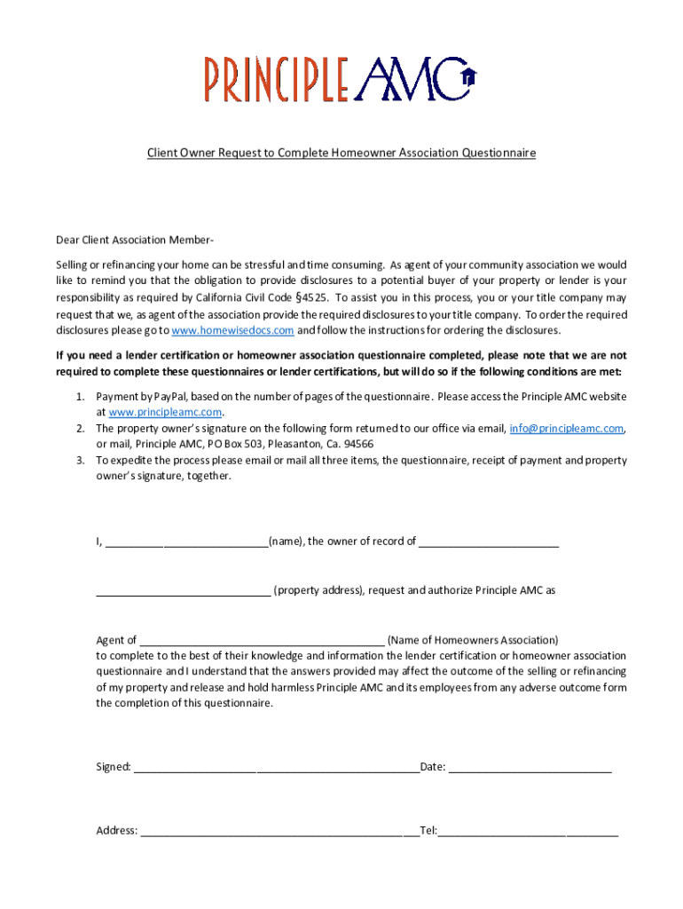 Client Owner Request to Complete Homeowner Association QuestionnaireDear Client Association MemberSelling or refinancing your home can be stressful and time-consuming. As agent of your community association