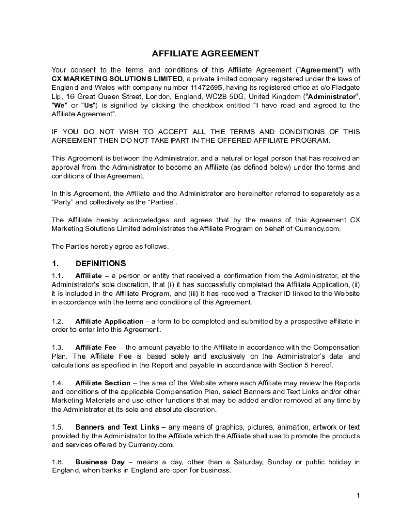 AFFILIATE AGREEMENT Your consent to the terms and conditions of this Affiliate Agreement (\” Agreement\”) with CX MARKETING SOLUTIONS LIMITED, a private limited company registered under the laws