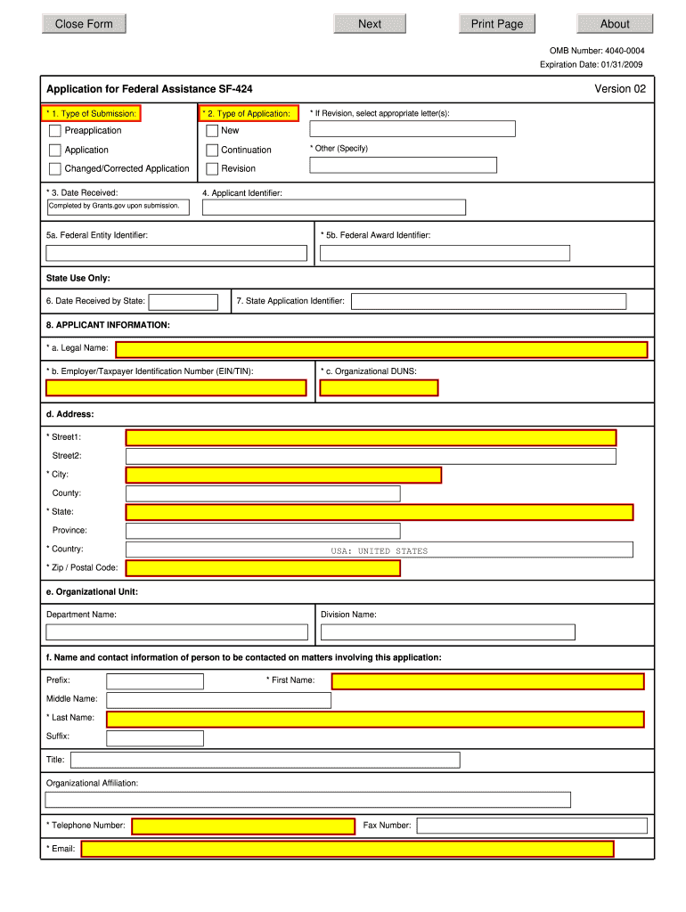Close Form Next Print Page About OMB Number: 4040-0004 Expiration Date: 01/31/2009 Version 02 Application for Federal Assistance SF-424 * 1. Type of Submission: * 2. Type of Application: Reapplication