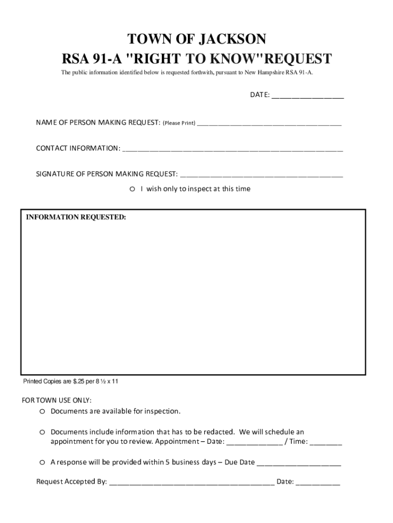 TOWN OF JACKSON RSA 91A \” RIGHT TO KNOW\” REQUEST The public information identified below is requested forthwith, pursuant to New Hampshire RSA 91A.DATE: ___ NAME OF PERSON MAKING REQUEST: (Please