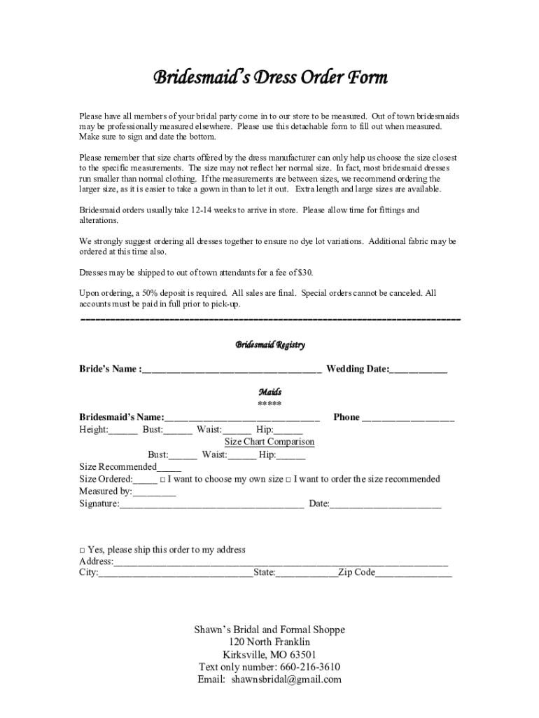 Bridesmaids Dress Order Form Please have all members of your bridal party come in to our store to be measured. Out of town bridesmaids may be professionally measured elsewhere. Please use this detachable