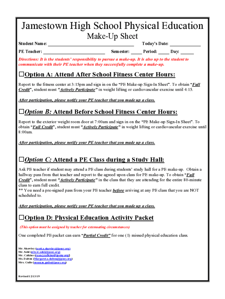 Jamestown High School Physical Education MakeUp Sheet Student Name: ___ PE Teacher: ___Today's Date: ___Semester: ___ Period: ___ Day: ___Directions: It is the students' responsibility to pursue a