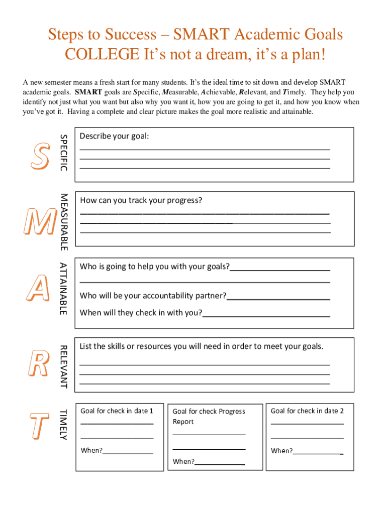 Steps to Success SMART Academic Goals COLLEGE It's not a dream, it's a plan! A new semester means a fresh start for many students. It's the ideal time to sit down and develop SMART academic goals.