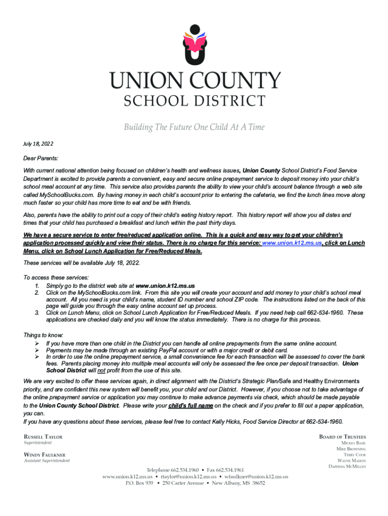 July 18, 2022, Dear Parents: With current national attention being focused on children's health and wellness issues, Union County School Districts Food Service Department is excited to provide parents