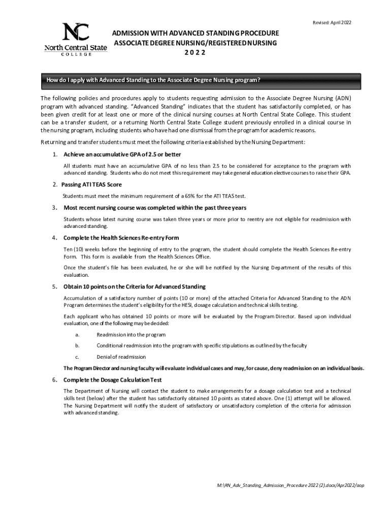Revised: April 2022ADMISSION WITH ADVANCED STANDING PROCEDURE ASSOCIATE DEGREE NURSING/REGISTERED NURSING 2022 How do I apply with Advanced Standing to the Associate Degree Nursing program? The following