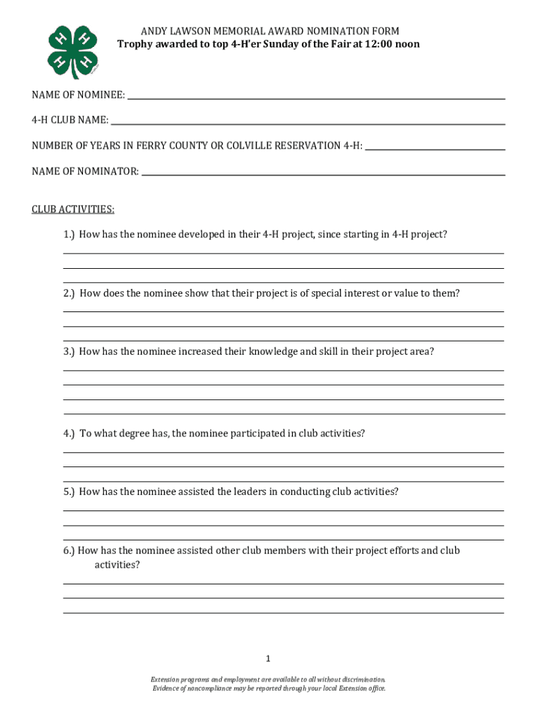 ANDY LAWSON MEMORIAL AWARD NOMINATION FORM Trophy awarded to top 4Her Sunday of the Fair at 12:00 noontime OF NOMINEE: 4H CLUB NAME: NUMBER OF YEARS IN FERRY COUNTY OR COLVILLE RESERVATION 4H:___NAME