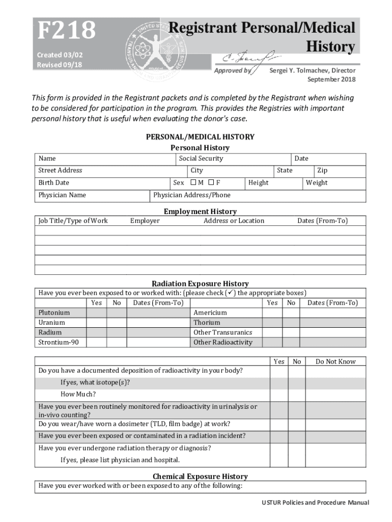 Registrants or individuals who are seeking medical treatment or services are required to file their personal medical history.