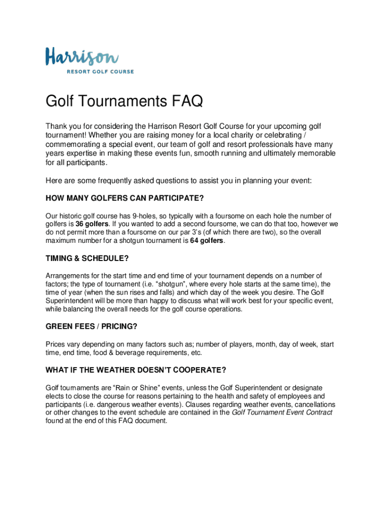 Golf Tournaments FAQ Thank you for considering the Harrison Resort Golf Course for your upcoming golf tournament! Whether you are raising money for a local charity or celebrating / commemorating a