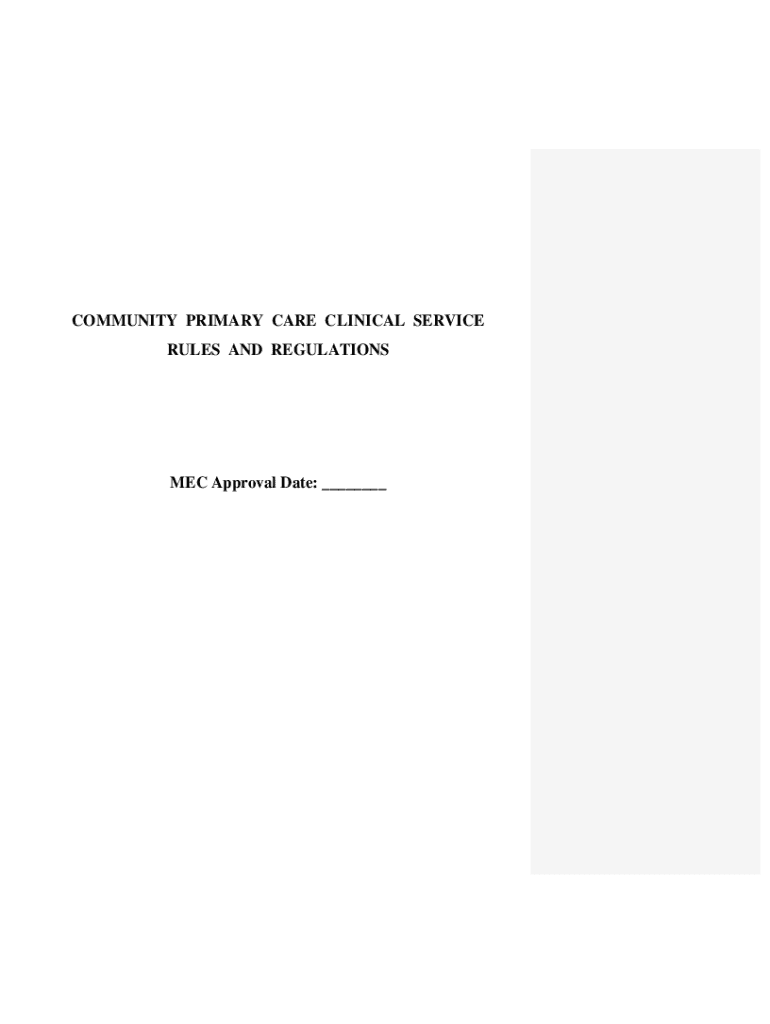 COMMUNITY PRIMARY CARE CLINICAL SERVICE RULES AND REGULATIONS MEC Approval Date: ___Zuckerberg San Francisco General Hospital 1001 Pottery Avenue San Francisco, CA 94110COMMUNITY PRIMARY CARE (CPC)