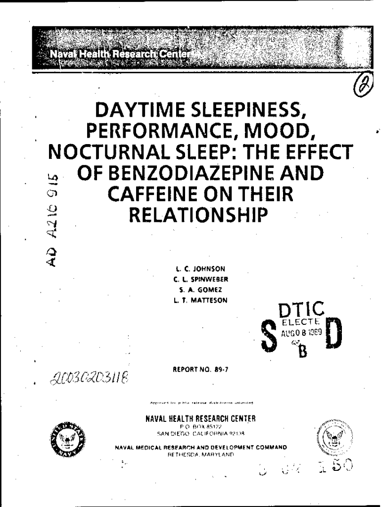 74,DAYTIME SLEEPINESS, PERFORMANCE, MOOD, NOCTURNAL SLEEP: THE EFFECT OF BENZODIAZEPINE AND CAFFEINE ON THEIR RELATIONSHIP _o×, L.C. JOHNSON C. L. SPINNER S. A. GOMEZ. T. MATTESONDTtO ELECTESAUGoB