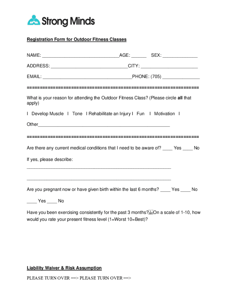 Registration Form for Outdoor Fitness ClassesNAME: ___AGE: ___SEX: ___ADDRESS: ___CITY: ___ EMAIL: ___PHONE: (705) ___ What is your reason for attending the Outdoor Fitness Class? (Please circle all