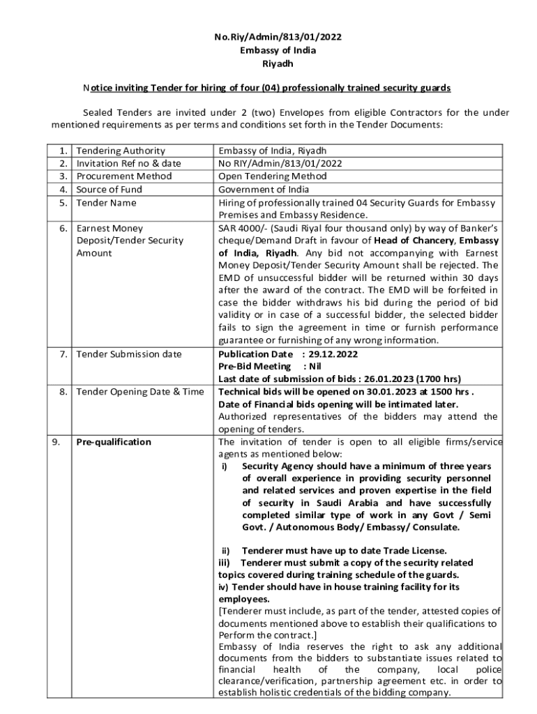 No. Ray/Admin/813/01/2022 Embassy of India Riyadh Notice inviting Tender for hiring of four (04) professionally trained security guards Sealed Tenders are invited under 2 (two) Envelopes from eligible