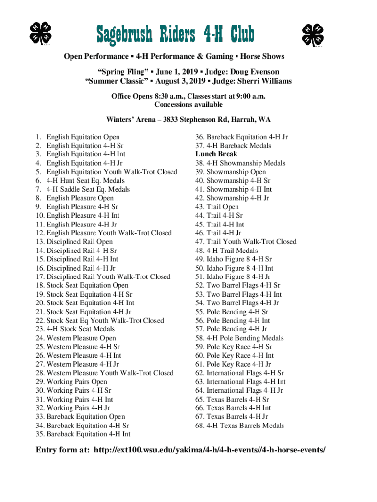 Sagebrush Riders 4H Club Open Performance 4H Performance & Gaming Horse Shows Spring Fling June 1, 2019, Judge: Doug Evensong Summer Classic August 3, 2019, Judge: Sherri Williams Office Opens 8:30