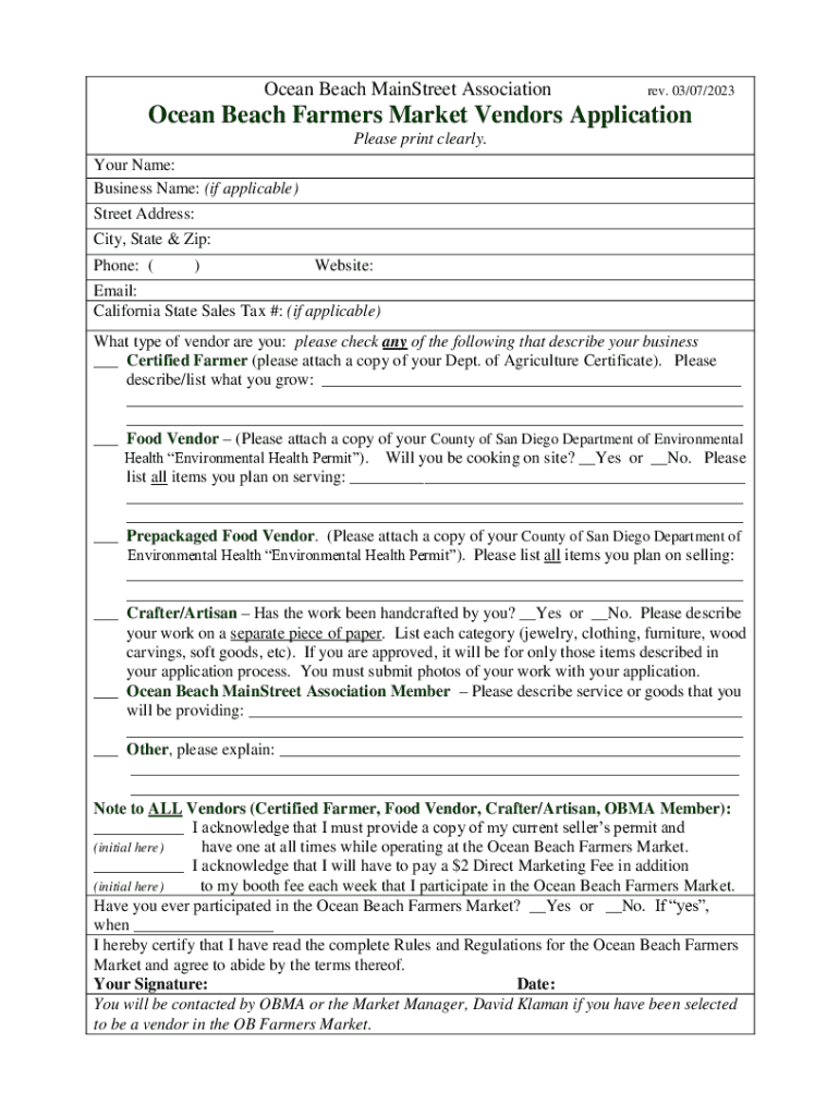 Ocean Beach Mainstream Association rev. 03/07/2023Ocean Beach Farmers Market Vendors Application Please print clearly. Your Name: Business Name: (if applicable) Street Address: City, State & Zip: