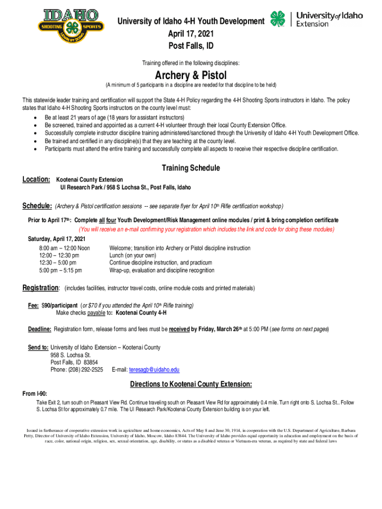 University of Idaho 4H Youth Development April 17, 2021, Post Falls, ID Training offered in the following disciplines:Archery & Pistol(A minimum of 5 participants in a discipline are needed for that