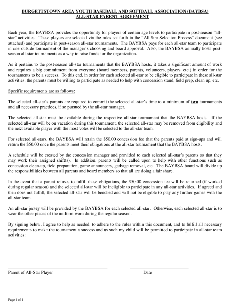 The all-star parent agreement is a document outlining the expectations and responsibilities of parents of athletes participating in all-star sports programs.
