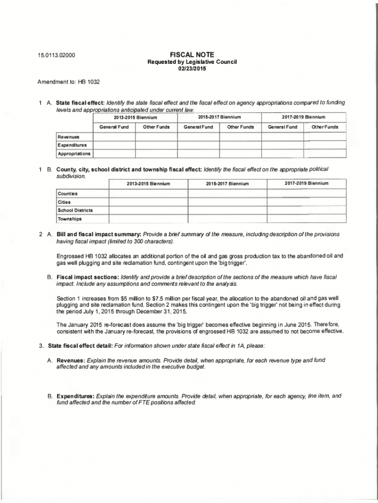 15.0113.02000FISCAL NOTE Requested by Legislative Council 02/23/2015Amendment to: HE 10321 A. State fiscal effect: Identify the state fiscal effect and the fiscal effect on agency appropriations compared