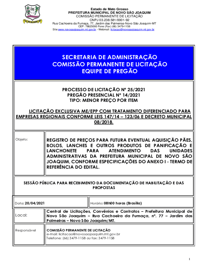 Est ado de Mato Grosso PREFECTURE MUNICIPAL DE NOVA SO JOAQUIM COMICS PERMANENT DE LICIT AO CNJ 03.238.581/000192 RUA Scholar the Human, 77, Jar dim was PalmeirasNovo So Joaquim CEP: 78625000 One