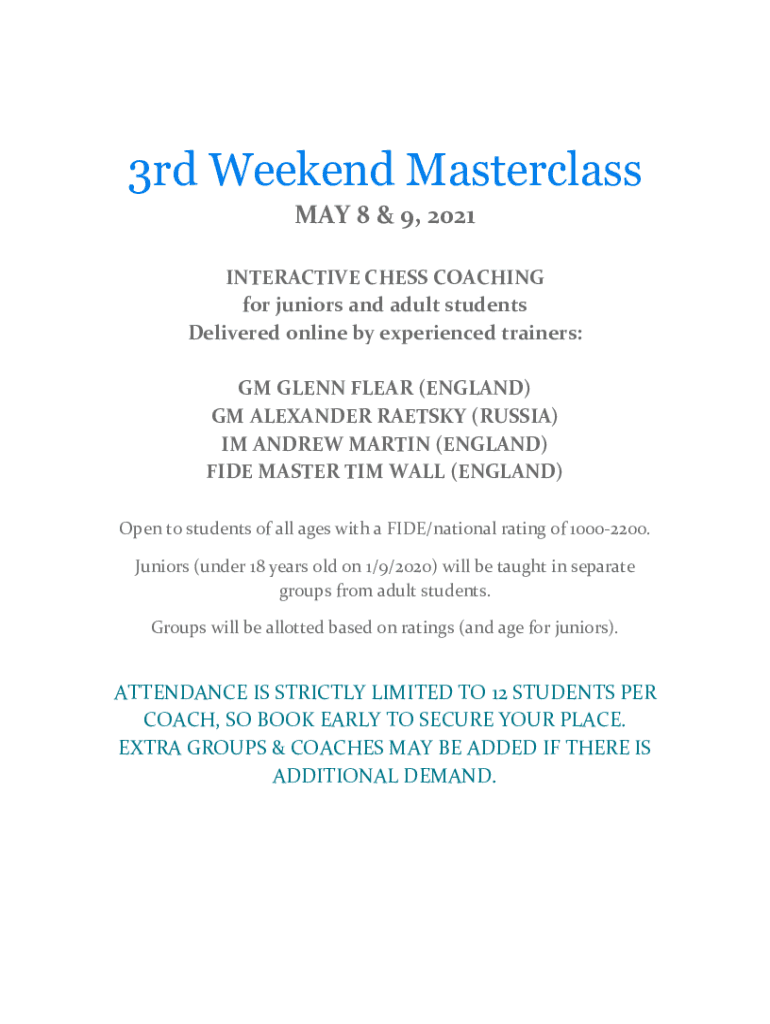 3rd Weekend Masterclass MAY 8 & 9, 2021 INTERACTIVE CHESS COACHING for juniors and adult students Delivered online by experienced trainers: GM GLENN CLEAR (ENGLAND) GM ALEXANDER RADETZKY (RUSSIA)
