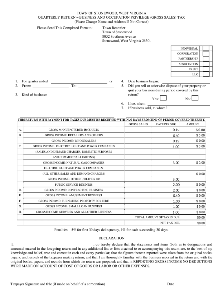 TOWN OF STONEWORK, WEST VIRGINIA QUARTERLY RETURN BUSINESS AND OCCUPATION PRIVILEGE (GROSS SALES) TAX (Please Change Name and Address If Not Correct) Please Send This Completed Form to:Town Recorder