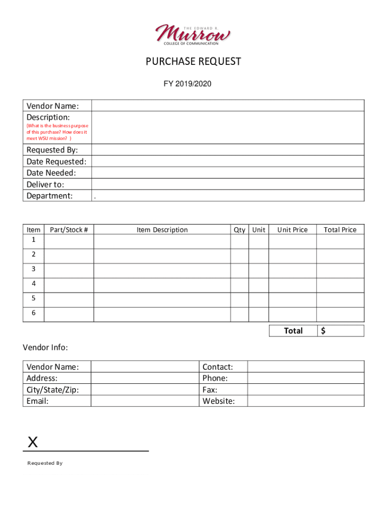 PURCHASE REQUEST FY 2018/2019 2019/2020 Vendor Name: Description:(What is the business purpose of this purchase? How does it meet WSU mission? )Requested By: Date Requested: Date Needed: Deliver to:.